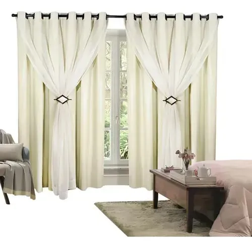 Oferece controle total da luminosidade e privacidade com elegância. Sua composição em PVC blackout bloqueia a entrada de luz, enquanto o voil proporciona um toque sofisticado e delicado ao ambiente.